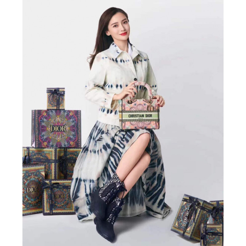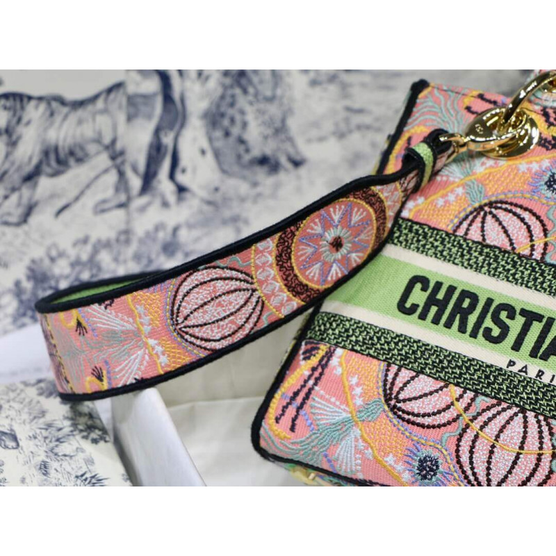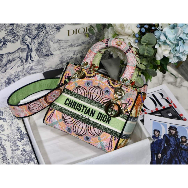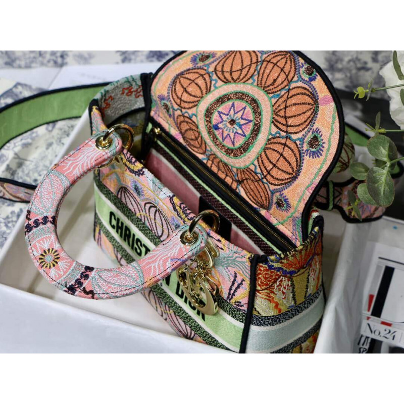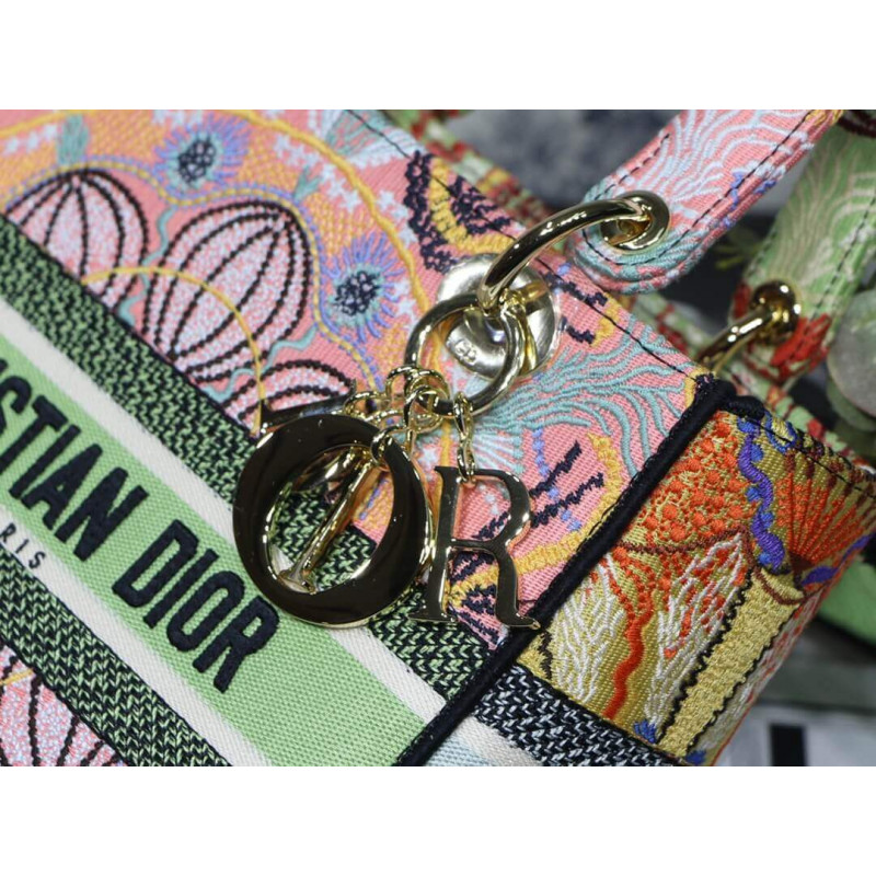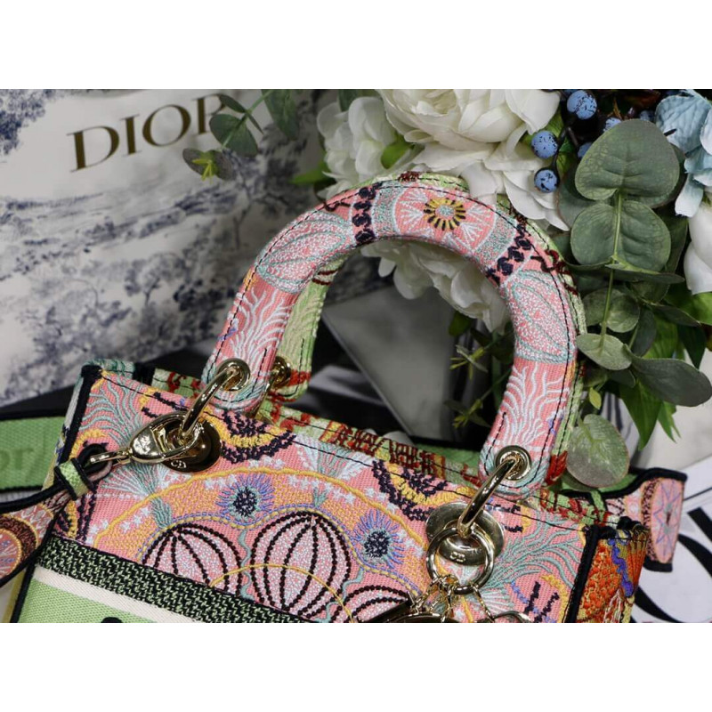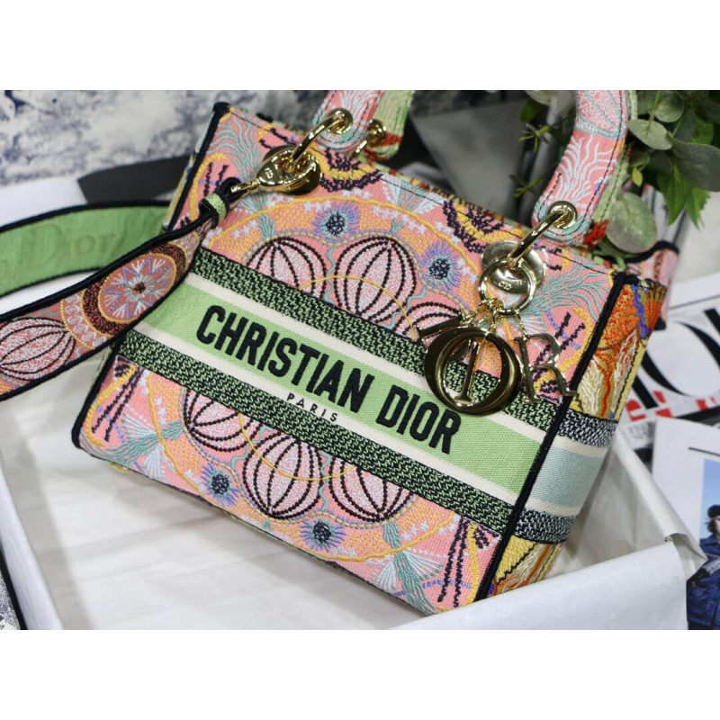 Lady D-Lite-tasken kombinerer klassisk elegance med husets modernitet. Denne stil, fuldt broderet med den grafiske Dior i lysmotiv, er inspireret af de lette festivaler i det sydlige Italien. Hver af de fire sider viser en anden farve til et patchwork-lignende look. Med en kristen Dior ‘signatur på fronten og tyk bleg guldfinish metal D.I.O.R.’ Charms, det er udstyret med en bred, reversibel og aftagelig broderet skulderrem. Mediumposen kan bæres for hånd, båret over skulderen eller crossbody og parres let med andre matchende Dior i lysskreationer i sæsonen.