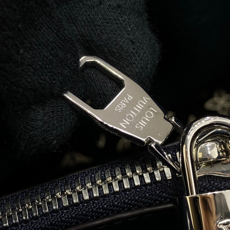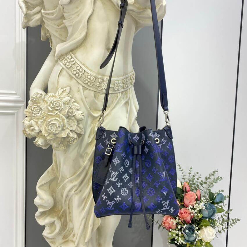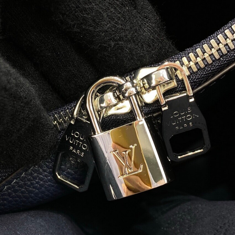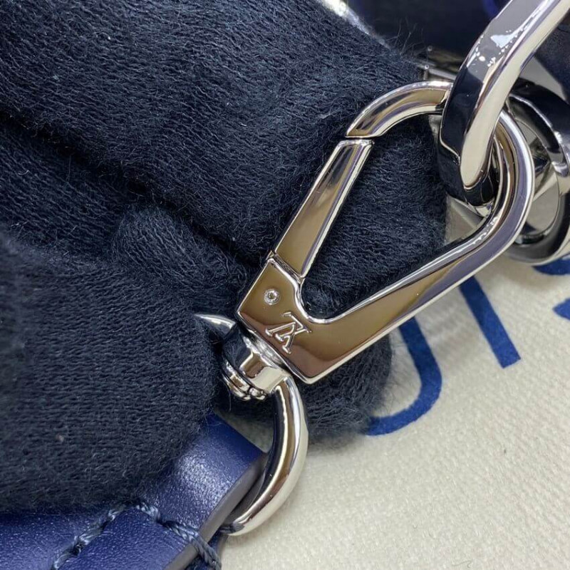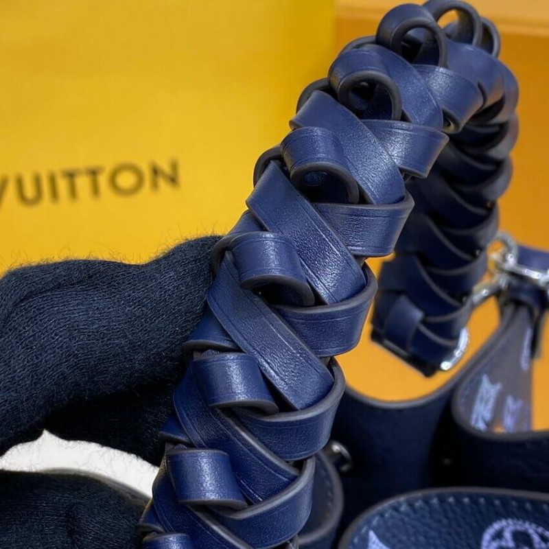 Perfekt til fly rejse, Muria Tote -tasken er lavet af smidige Mahina perforeret kalveskind. Det perforerede monogrammønster i marineblået kalveskind fremhæves af Gradient Whites og Blues på LVS- og Monogram-blomsterne. Et flettet håndtag muliggør hånd- og albue bære, mens en aftagelig læderrem tillader behagelig skulder og tværkropslitage.