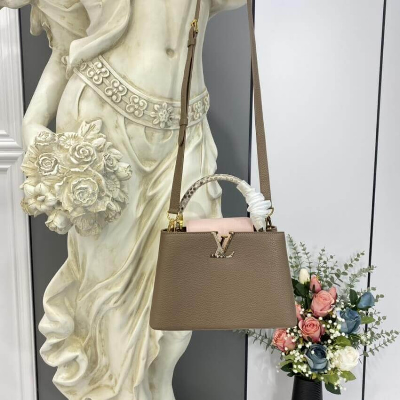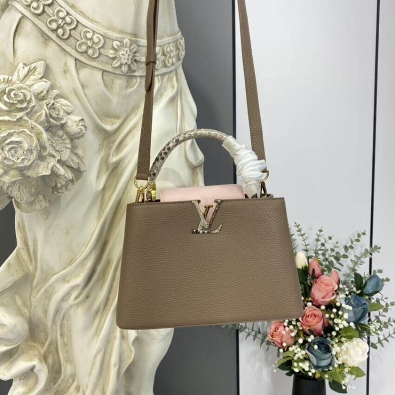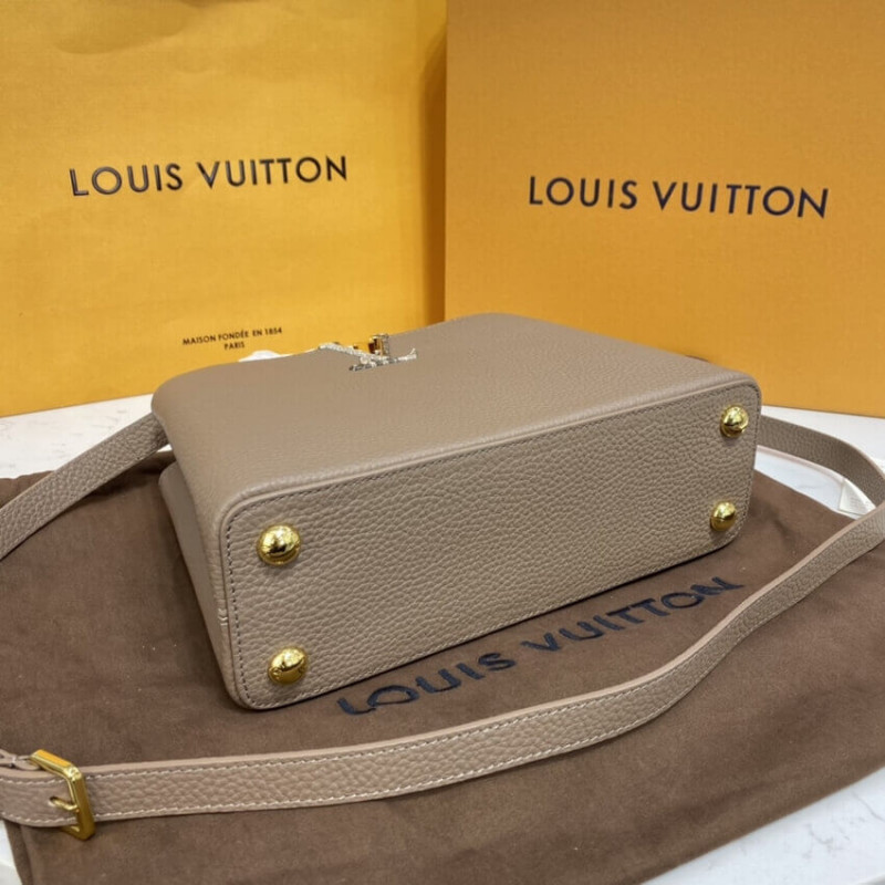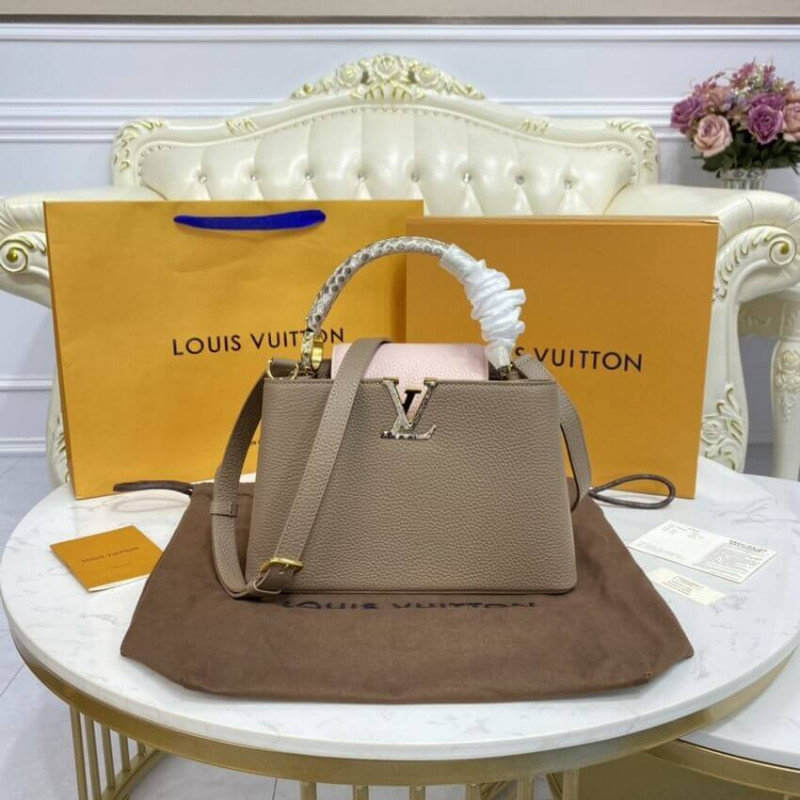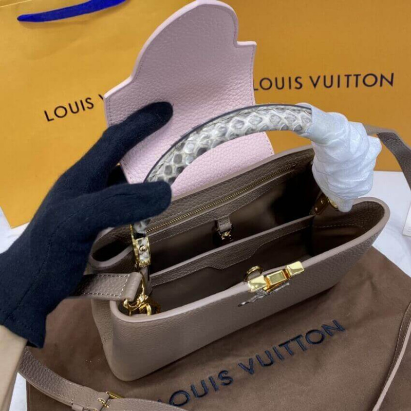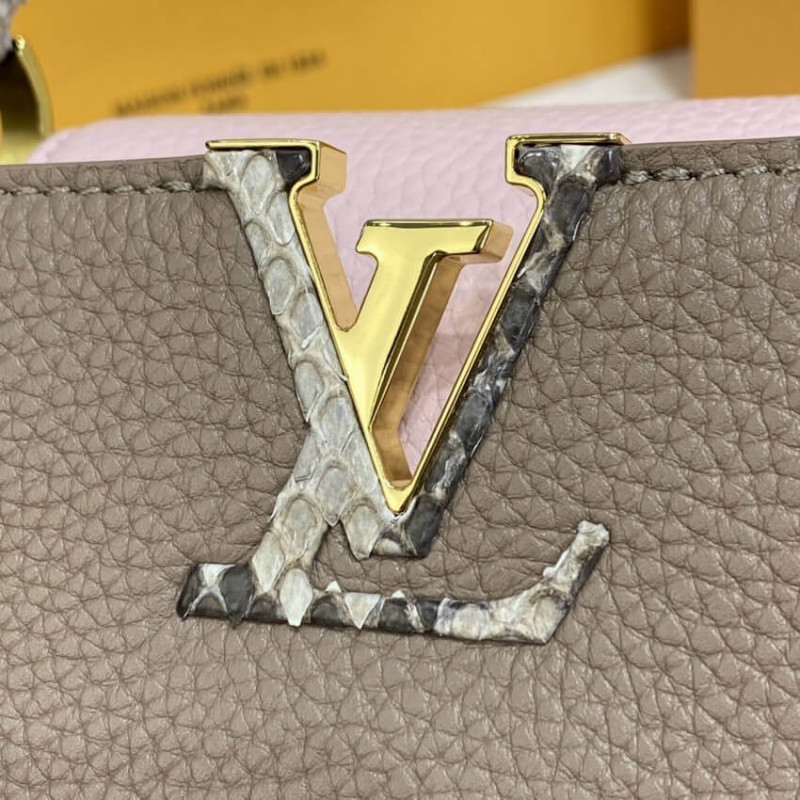 Denne sæson kommer en elegant ny colorway til Capucines BB -håndtaske: en delikat kombination af bløde toner, forbedret af eksotiske Ayers -læder på håndtaget og LV -signaturen. Det øverste håndtag og brede aftagelige rem leverer flere bæreindstillinger. Et sofistikeret look til dag eller aften.