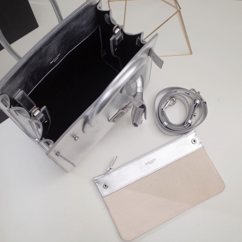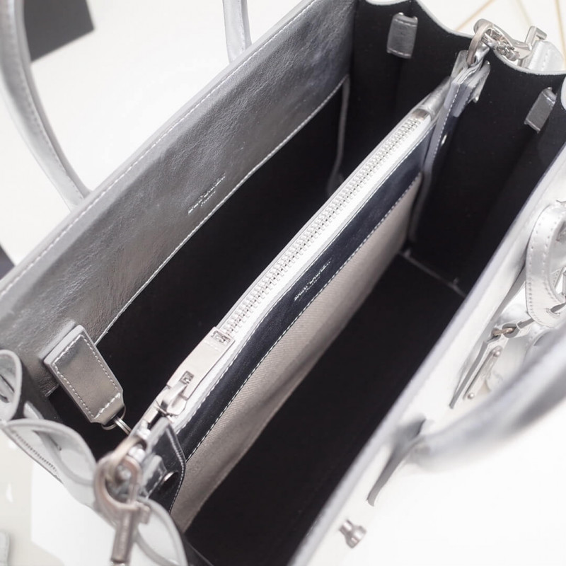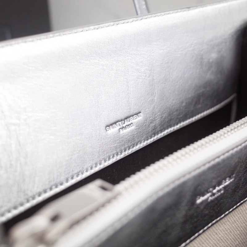 Signatur Saint Laurent -taske med blød konstruktion, rørformede håndtag, harmonika sider, kompressionsstropper med faner, præget Saint Laurent -signatur og aftagelig, justerbar skulderrem.