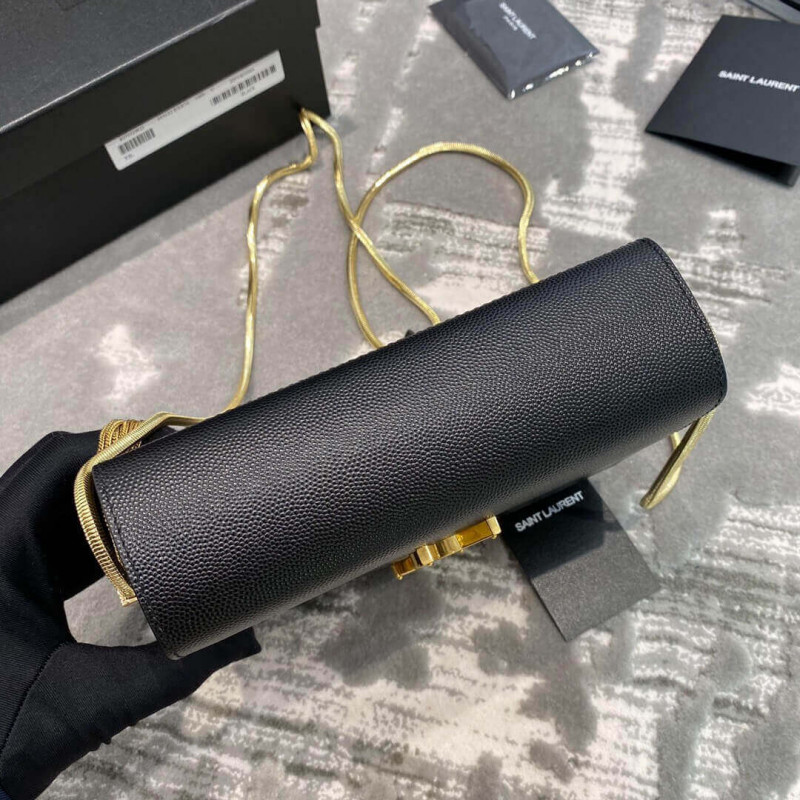Saint Laurent Monogram Box Bag med klap dekoreret med metal YSL-initialer og med en firkantet omega-kæde skulderrem med kvaster.